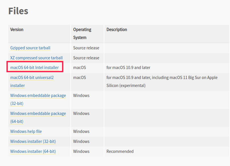 - Scroll to the bottom and click macOS 64-bit Intel installer to start the download.